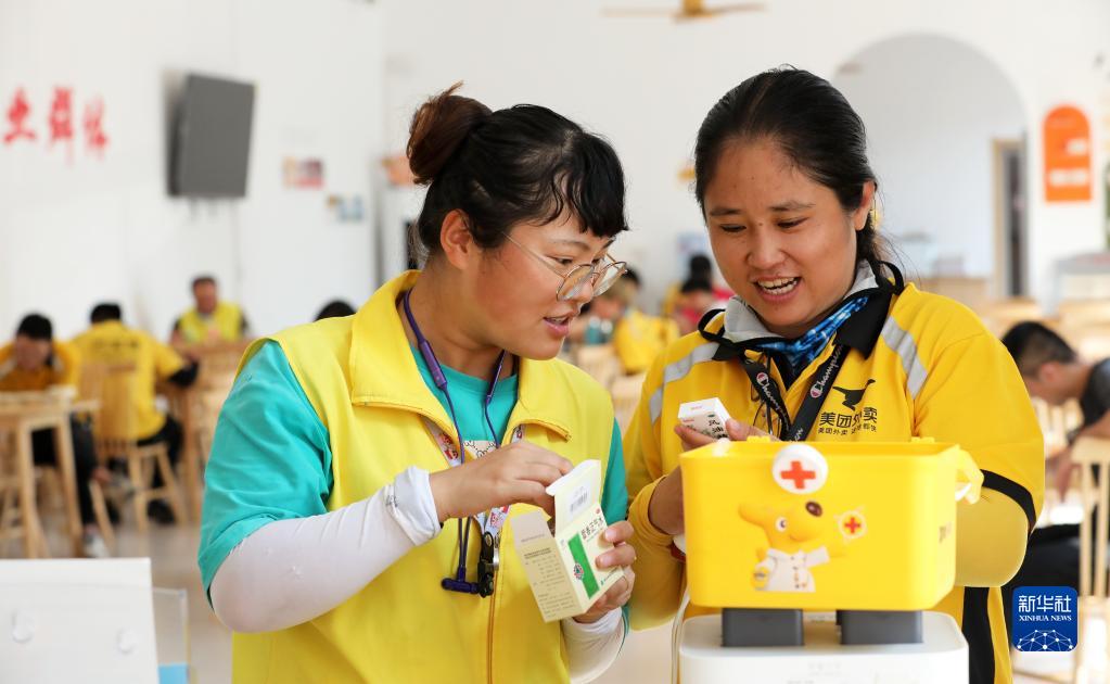7月9日,在郯城县郯城街道龙泉社区“小哥食堂”,外卖骑手在便民药箱内取用防暑药品。新华社发(张春雷 摄)