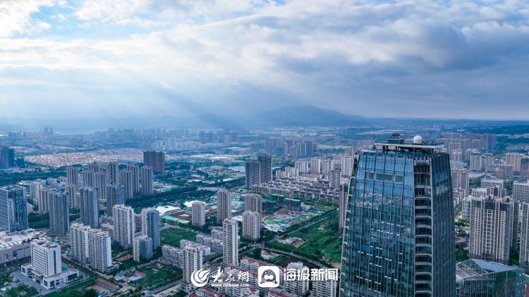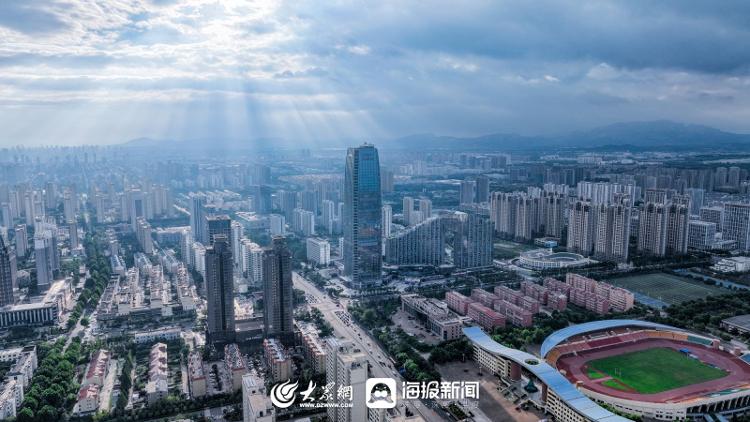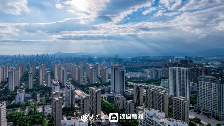 7月23日傍晚,日照市区天空出现“丁达尔效应”,一缕缕阳光从云间洒向大地,呈现出“光的形状”。海报新闻记者通过航拍镜头拍摄到这一壮观的景象:阳光透过浓厚的云层,一束束光柱从天而降,使得整座城市沐浴在淡淡的光芒中,画面十分美丽。