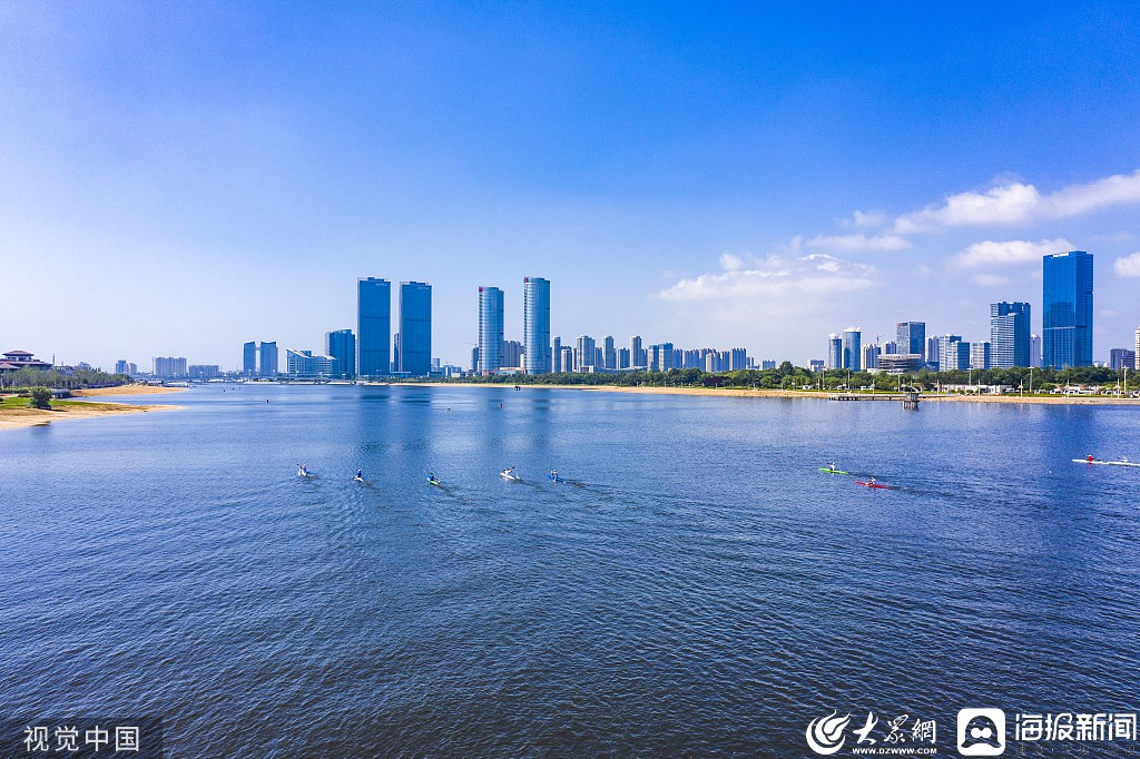 2022年7月,山东省日照市,水运基地,皮划艇训练队员正在泻湖练习。
