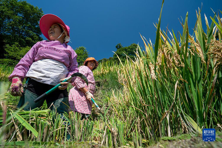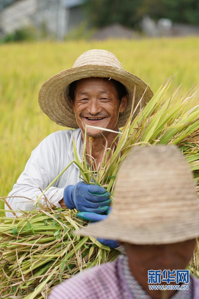 村民在梯田中收割水稻(9月7日摄)。新华社记者 江文耀 摄