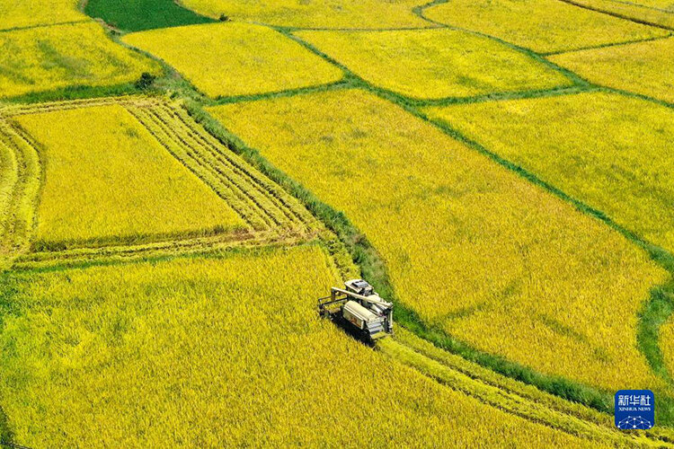 8月11日,在江西省宜春市上高县锦江镇垴上村,农民驾驶收割机收割稻谷。新华社发(陈旗海 摄)