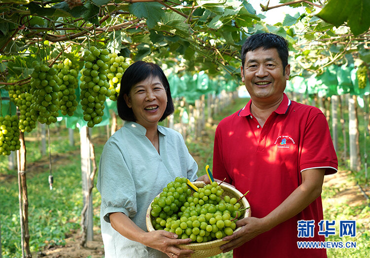9月19日,看到丰收的景象,果农李兆发与妻子严秀玲笑得合不拢嘴。新华网 尹君 摄