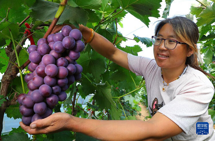 9月6日,在丁家房镇大蛇山子村,果农在大棚里查看葡萄成熟情况。新华社记者 杨青 摄