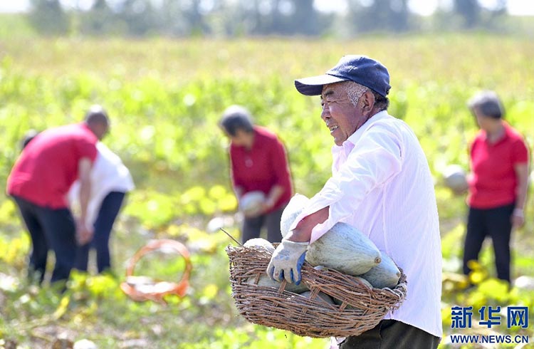 9月11日,呼和浩特市赛罕区金河镇大一间房村农民在收获甘龙栗南瓜。新华网发(王正 摄)