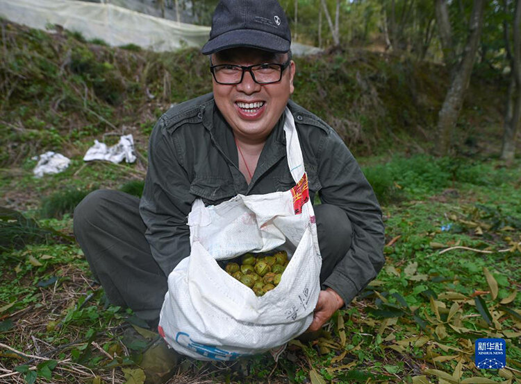 9月7日,在淳安县临岐镇审岭脚村的山核桃林中,农户鲁梦进展示刚刚采收的山核桃果。新华社记者 徐昱 摄