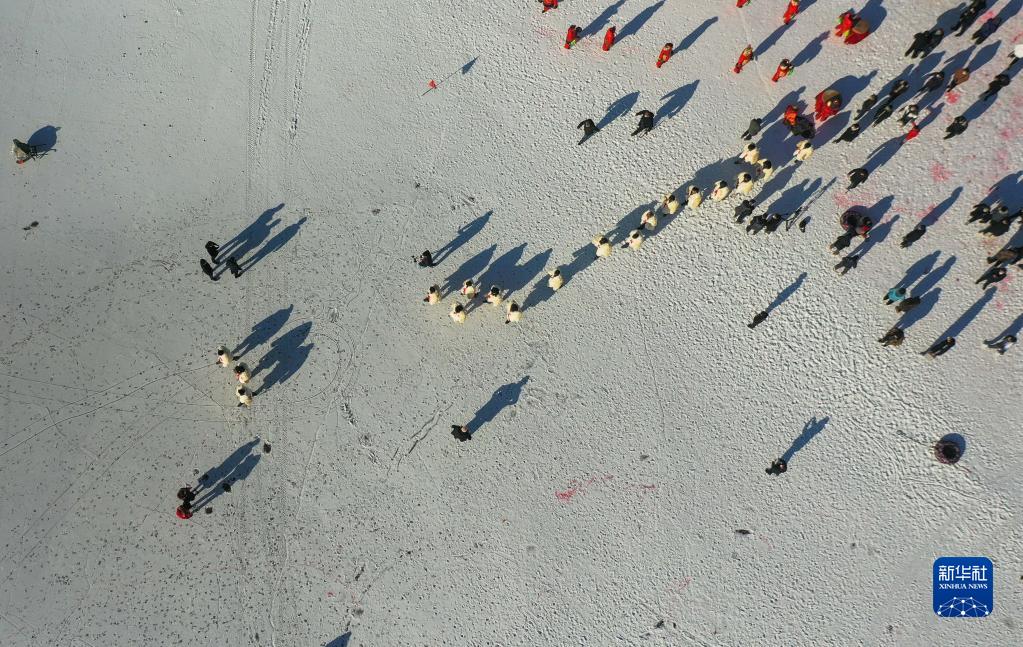 1月9日,在土默特左旗哈素海,身穿白色外套的冬捕人出发捕鱼(无人机照片)。