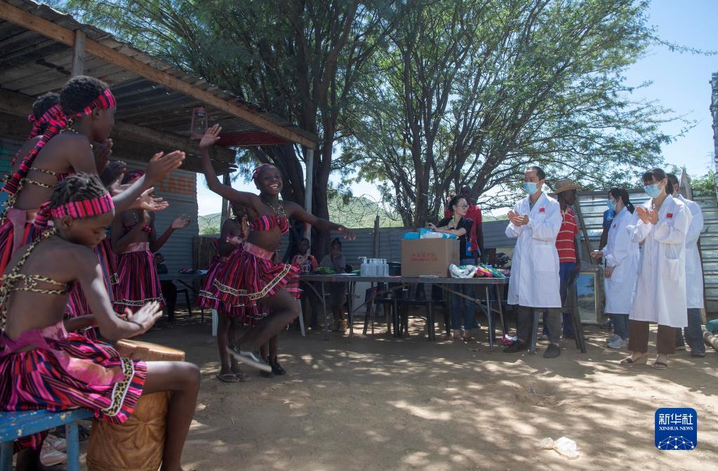 2月16日,在纳米比亚首都温得和克哈瓦那非正式定居点的弗兰斯艺术培训中心,同学们用传统舞蹈感谢中国医生。