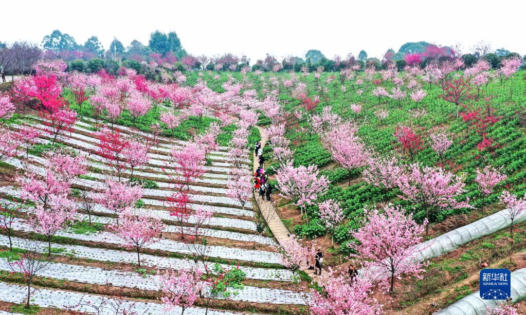 2月19日,游客在四川省泸州市江阳区丹林镇建设村樱花谷景区游玩。
