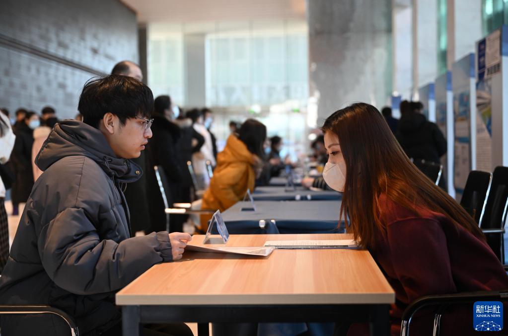2月19日,在天津经济技术开发区春季促就业暖心行动公益现场招聘会,招聘企业工作人员与求职者交流。