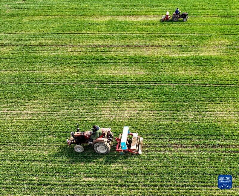 2月21日,在安徽省亳州市谯城区十河镇位李村,农民给麦田施肥(无人机照片)。