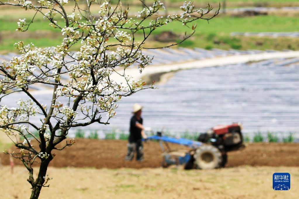 春光明媚,万物生长,农民在田间劳作,到处生机勃勃。