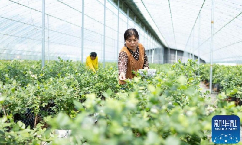 4月13日,山东省临沂市临沭县大兴镇一处蓝莓种植大棚内,农民在采摘蓝莓。新华社记者 范长国 摄