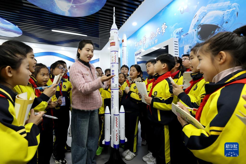 4月24日,在山东省枣庄市文化路小学航天科普馆,老师为学生们讲解航天知识。