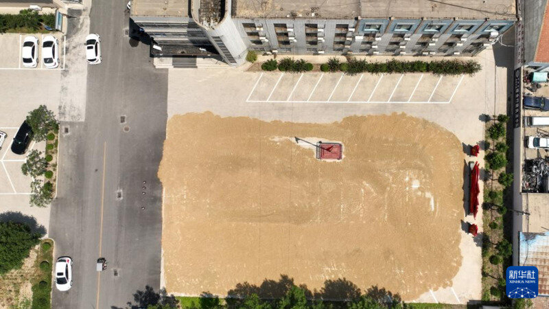 这是在阳信县金阳街道办事处办公楼前晾晒的小麦(6月13日摄,无人机照片)。新华社发(霍向锋 摄)