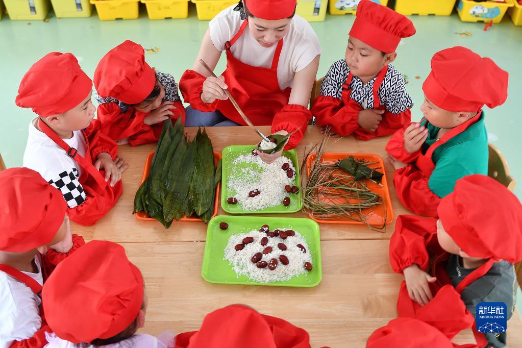 6月19日,山东省烟台市福山区清洋街道中心幼儿园的小朋友在老师指导下学习包粽子。