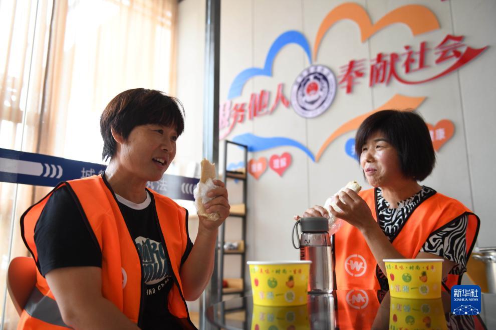 7月21日,山东省临沂市郯城县环卫工在“爱心驿站”就餐纳凉。