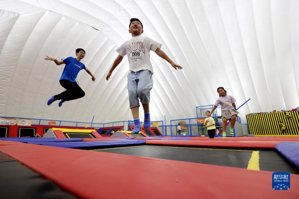 8月2日,孩子们在山东省枣庄市冰雪文体中心蹦床上进行蹦跳锻炼。