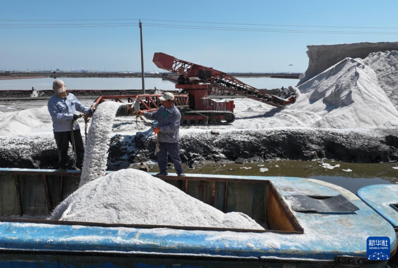 近日,河北省唐山市曹妃甸区南堡盐场的35万亩盐田迎来春盐收获期,工人利用晴好天气加紧收获,盐田里处处繁忙景象。