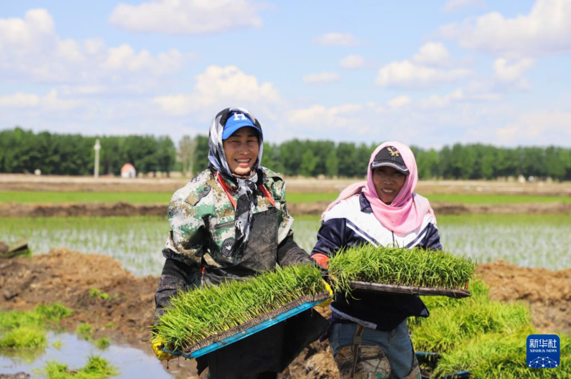 5月19日,农民在内蒙古兴安盟突泉县东杜尔基镇明星村的稻田旁搬运秧苗。