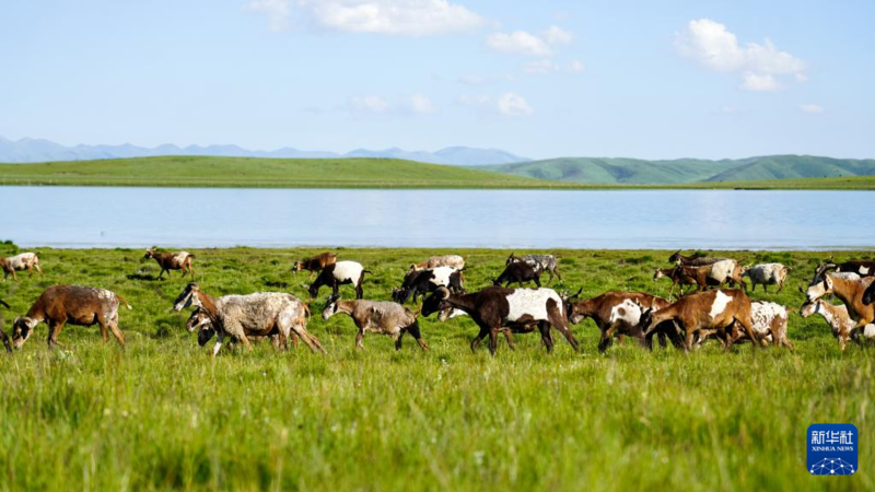 夏日,青海省黄南藏族自治州泽库县境内水草丰饶,草原、蓝天、牛羊构成别致的美景。泽库县平均海拔3700米,2022年入选全国草原畜牧业转型升级试点县。
