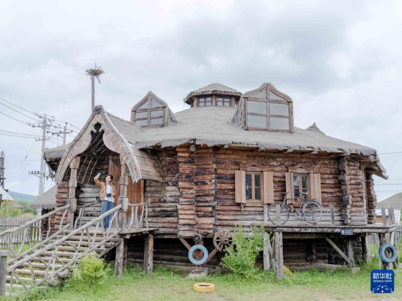 8月21日,在内蒙古恩和俄罗斯族民族乡,游客在当地传统民居木刻楞前拍照留念。