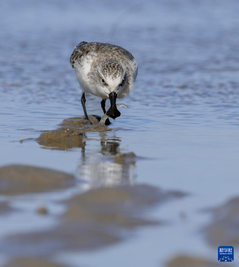 11月9日,一只勺嘴鹬在泉州围头湾滩涂上捕食海虾。