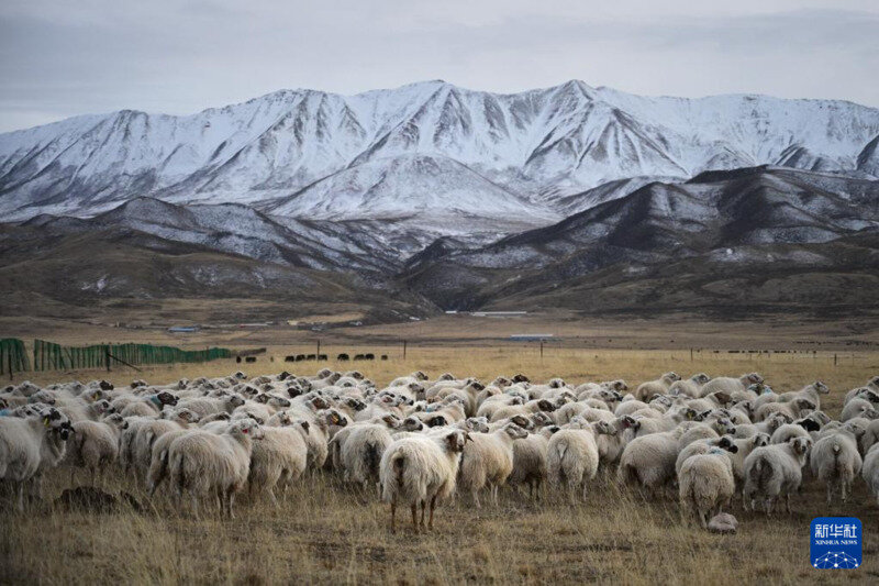 这是11月9日在青海省海北藏族自治州祁连县仟户牧场草场拍摄的无角藏羊羊群。