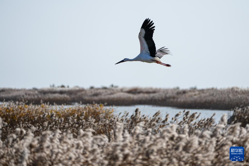 11月13日,在黄河三角洲国家级自然保护区,白鹳在飞翔。