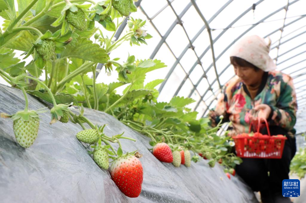 12月16日,农民在山东省滨州市博兴县湖滨镇柳童村大棚里采摘草莓。