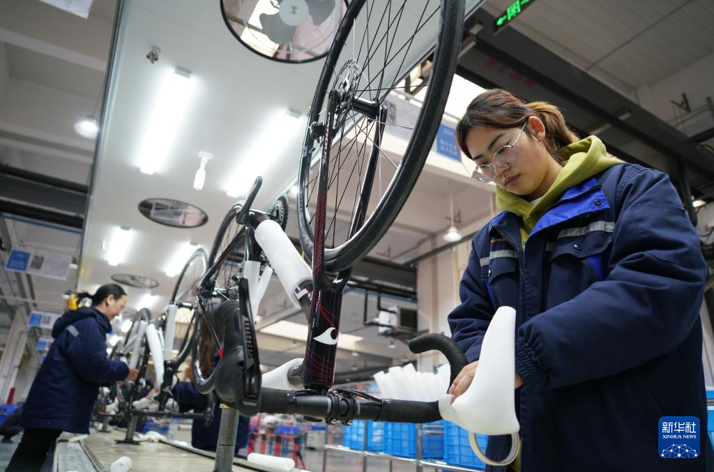 12月18日,在位于山东德州乐陵市的泰山体育产业集团有限公司的生产车间,工人在组装运动自行车。