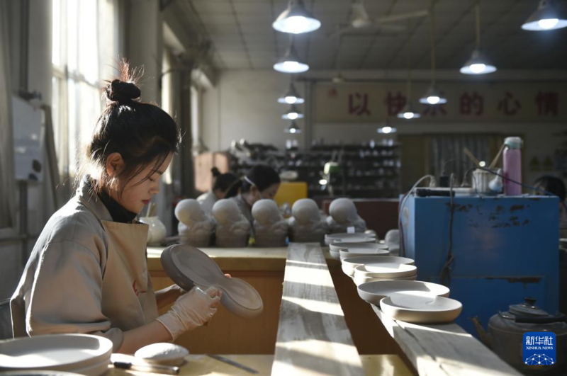 12月25日,工作人员在河北省曲阳县一家定瓷生产企业的车间里加工定瓷产品。
