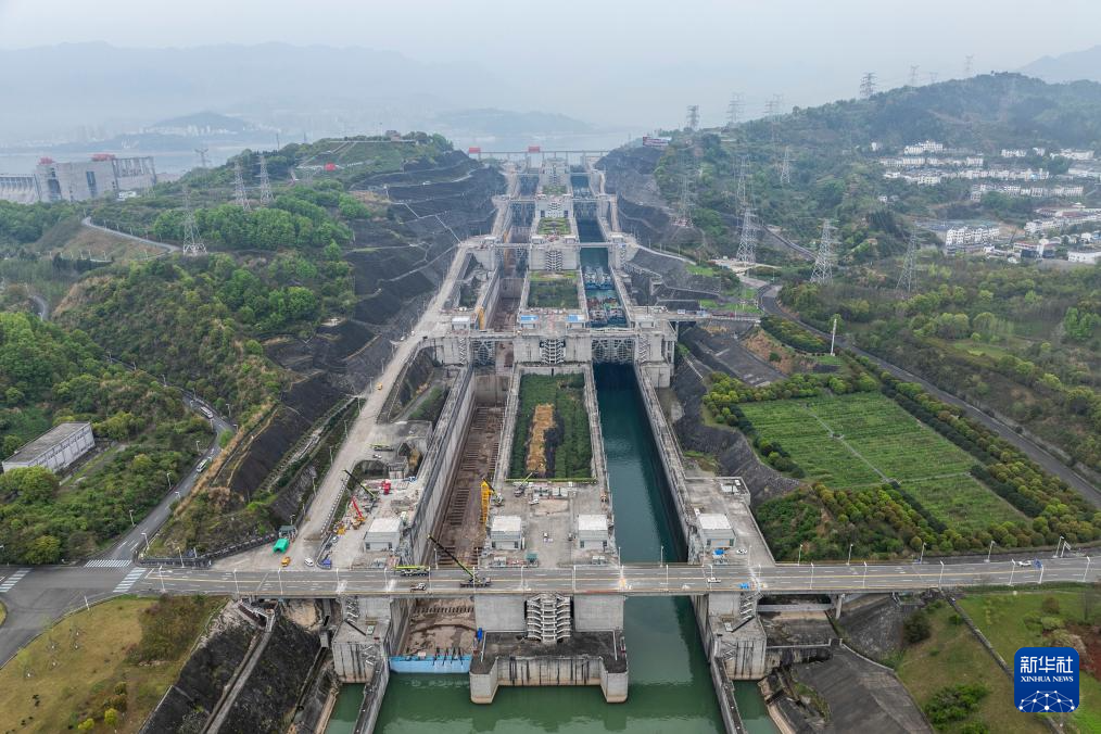 4月2日,三峡枢纽南线船闸加紧检修,北线船闸有序通航(无人机照片)。