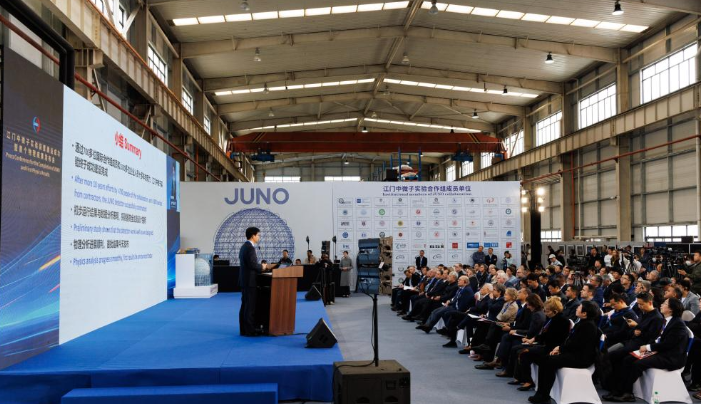 11月19日,在广东省江门市举行的发布会上,中国科学院高能物理研究所副所长、江门中微子实验国际合作组物理分析负责人温良剑在报告首个