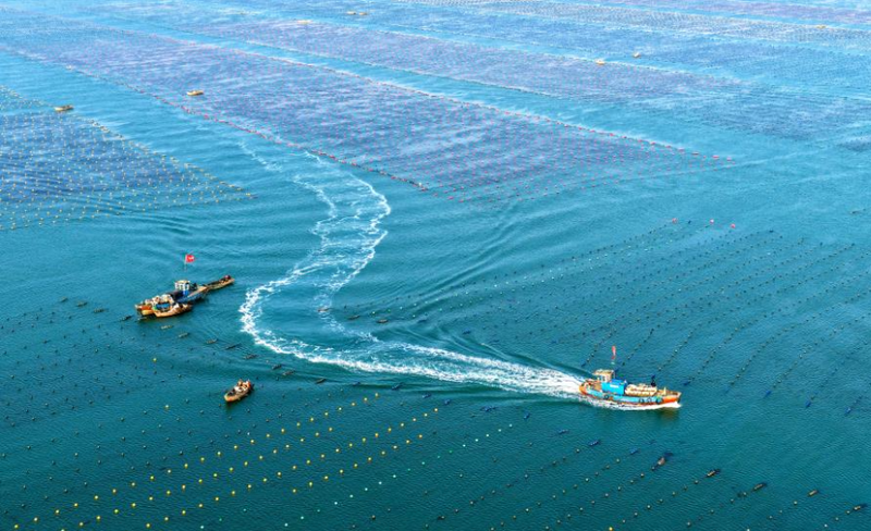 11月19日,在山东省荣成市爱伦湾海带养殖区,工人进行海带播苗作业(无人机照片)。 眼下,山东省荣成市海带播苗作业全面展开,养殖