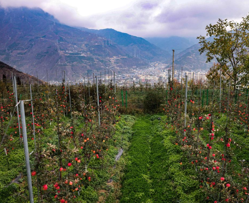 11月18日拍摄的四川茂县凤仪镇坪头村九顶农牧苹果园一角。 地处青藏高原东南边缘、岷江上游的四川省阿坝藏族羌族自治州茂县,光照足