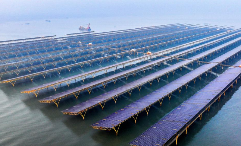 11月16日拍摄的青岛市即墨区鳌山湾海域海上桩基固定式光伏发电项目(无人机照片)。 沿海经济大省山东近年来聚焦“双碳”战略目标,
