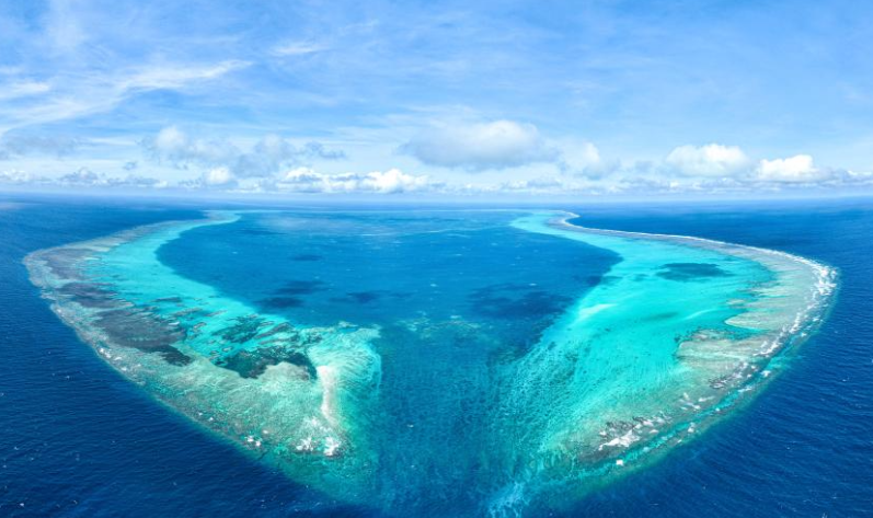 11月14日拍摄的黄岩岛风光(无人机全景照片)。 黄岩岛位于我国中沙群岛,湛蓝的海水和岛上的礁盘相映成趣,如同一颗镶嵌在南海之中