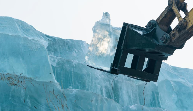 11月24日,在哈尔滨冰雪大世界存冰场,工程车辆从冰垛上取冰。 11月24日,第二十七届哈尔滨冰雪大世界存冰启用,园区冰建建设将于11