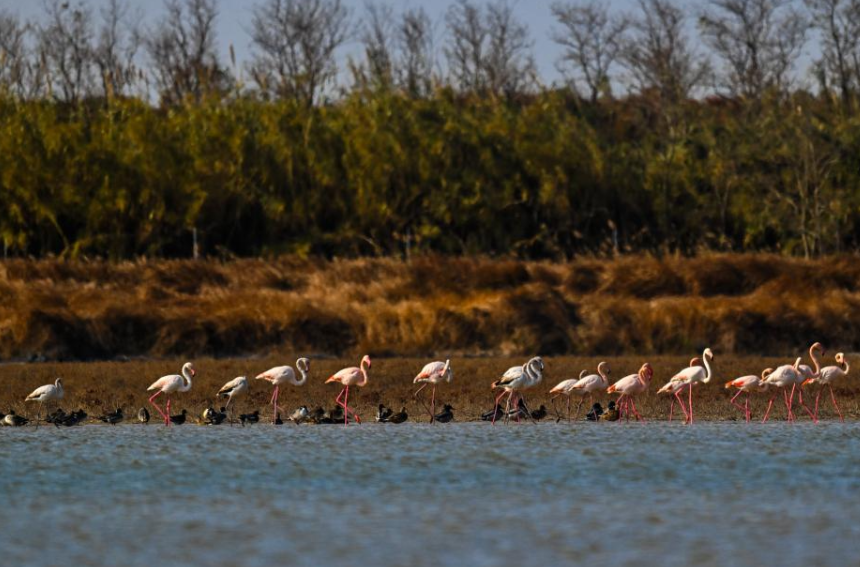 江苏东台:火烈鸟飞抵条子泥湿地越冬