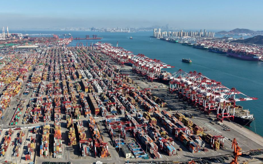 12月4日,一艘满载集装箱的货轮驶离青岛港前湾港区码头(无人机照片)。 连日来,山东港口青岛港巨轮频靠,作业繁忙,各单位向着全