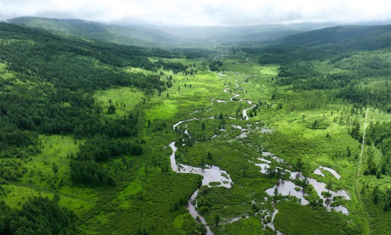 7月6日拍摄的阿尔山国家森林公园夏日风光(无人机照片)。 夏日时节,内蒙古阿尔山国家森林公园内满目苍翠,景色如画,吸引游客前来