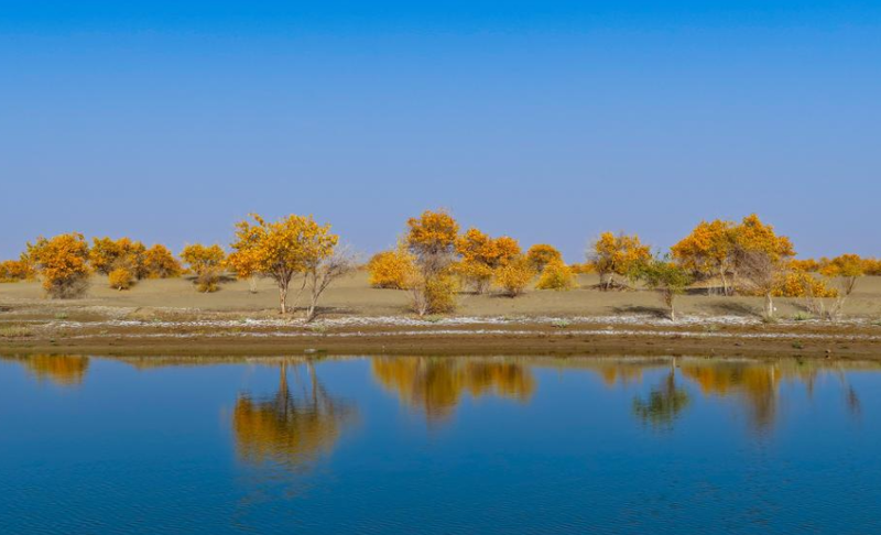 在新疆和田地区和田县翡翠湖,成片胡杨林坐落其中(无人机照片,10月20日摄)。 时下,新疆和田地区的胡杨迎来最佳观赏期,成片换妆