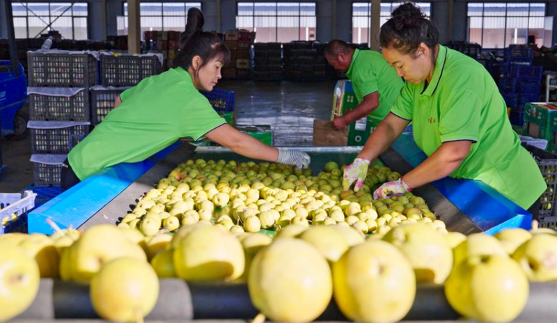 9月21日,工人在分拣南果梨。 近日,辽宁省鞍山市海城市的南果梨深加工企业迎来生产旺季。在当地的南果梨加工厂内,工人们忙着将新