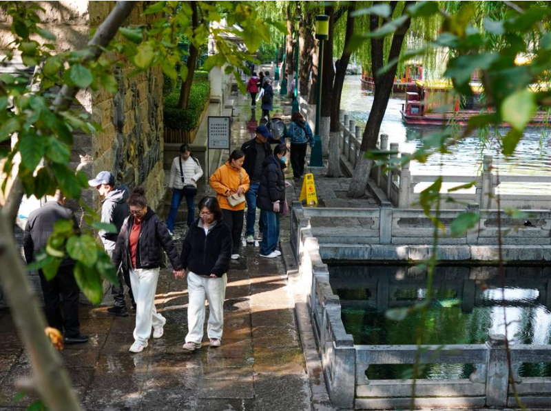 10月22日,人们在山东济南泉水绿道步行。 近日,山东省济南市泉水喷涌有力,吸引了众多市民和游客到泉水绿道行走,观赏泉水景观。济