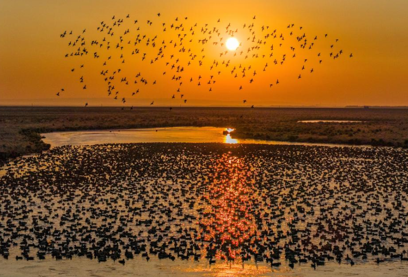 10月22日,在黑龙江挠力河国家级自然保护区,候鸟在晨光中翔集(无人机照片)。 时下正值黑龙江省候鸟迁徙高峰期,全省各个候鸟栖息