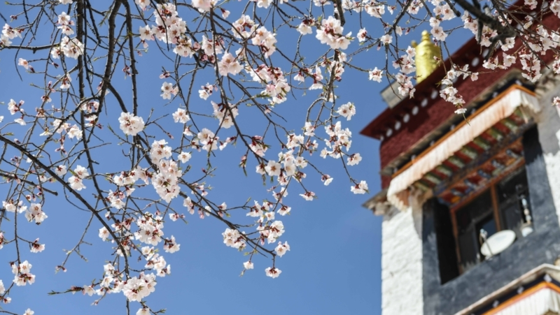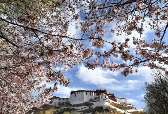 3月28日,从帕邦喀远眺布达拉宫。位于拉萨北部山坳里的古刹帕邦喀,周边桃花盛开,春意浓浓。 中新社记者 贡嘎来松 摄 3月28日,