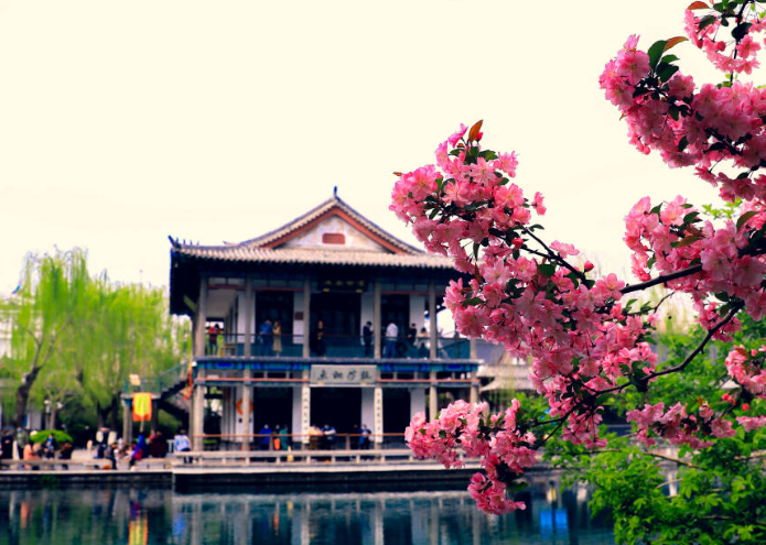 五龙潭公园内成片的海棠迎风绽放,花瓣在阳光下翩翩起舞,美得如诗如画。
