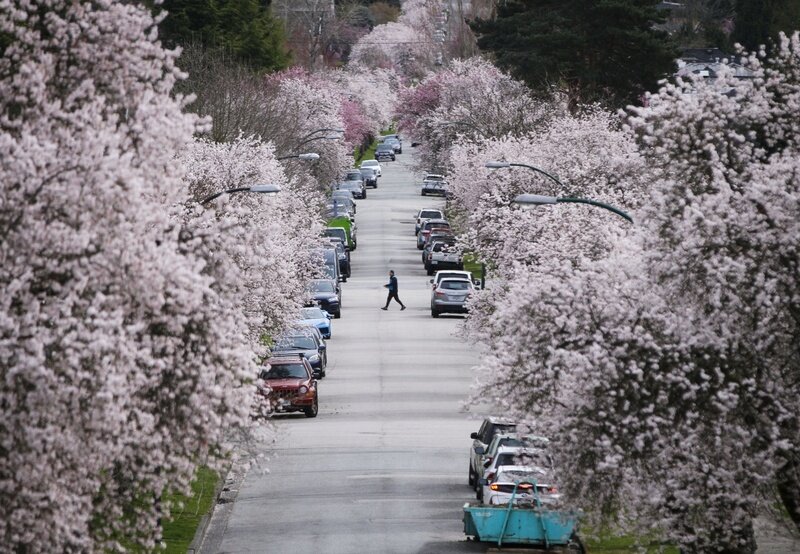 3月24日,在加拿大温哥华,一条街道两旁樱花绽放。 新华社发(梁森摄)