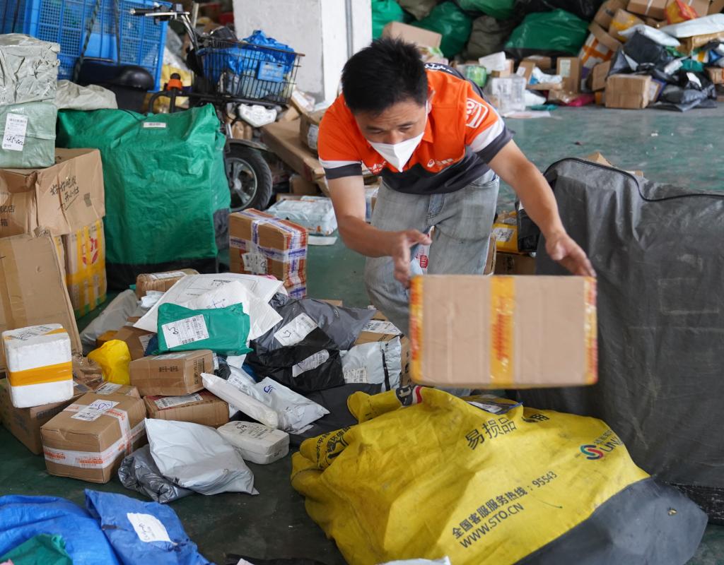 6月8日,申通快递上海梅陇公司一名快递员整理即将配送的包裹。新华社记者 杨有宗 摄