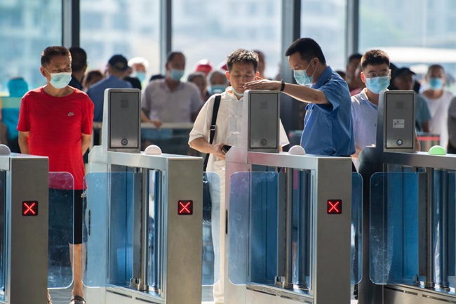 7月1日,在株洲火车站安检区,旅客进行人脸识别通过安检。新华社记者 陈思汗 摄